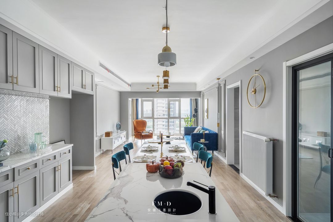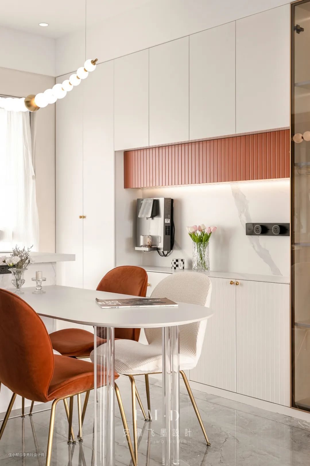 如果还是习惯烧水喝,那么可以增加水槽+插座,餐边柜即可做水吧台使用。别忘了台面上要留2-3个插座,后期可以烧水、装咖啡机、豆浆机等。