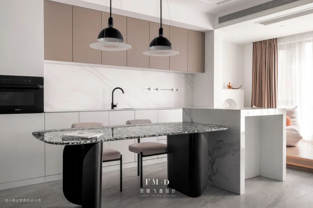 ●高度还是建议90cm上下,如果要摆放水壶等东西,建议选择耐水的石材台面,可适当增加插座,进行充电。
