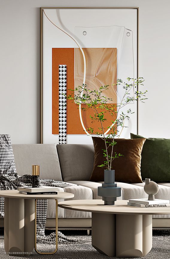 灰色布艺沙发,将平面的柔软感融入立体的多样化层次。沙发背景墙搭配质朴无华的挂画,加入一抹亮色,让原本的清冷气息,变得舒缓起来。