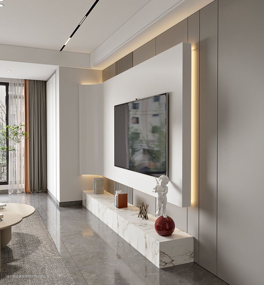 电视背景墙采用的是悬浮石膏内嵌灯带,搭配木格栅和硬包,让空间看起来更轻盈通透。采用曲面造型,搭配氛围灯带,瞬间整面电视墙线条都柔和了许多,在不经意间凸显生活品质。