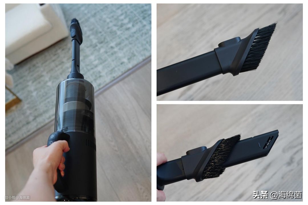 附带了三种不同吸尘刷头,各有用处,还搭配了延长杆,后文实际体验中也会再次看到。其实这样一套就是非常完整的吸尘系统了,叫随手吸感觉还是有点谦虚了。