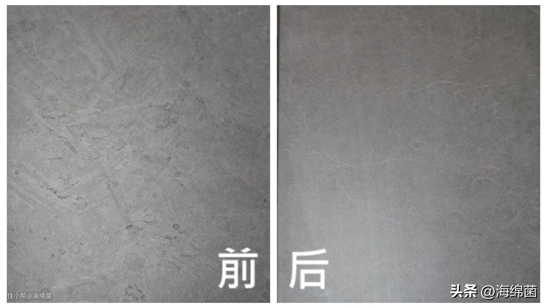 下图是我家厨房地砖清洁前后的细节对比,家里如果经常烧饭的话,地上难免会有各种油星水渍和污迹,几天不擦就会变成左边这种顽固的污渍,需要用湿抹布用力擦拭才行。