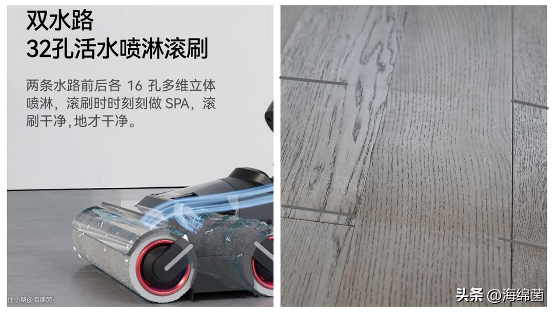 同时滚刷采用了双水路32孔的活水喷淋设计,不仅能保持滚刷本身的清洁度,地面的水痕也非常均匀。可以参考下图,我把单次过后的水痕两侧标注了一下便于分辨,可以看到湿润度均匀,没有水滴凝聚的情况,拖地干了以后地面上也不会留下奇奇怪怪的水痕,使用体验很不错。