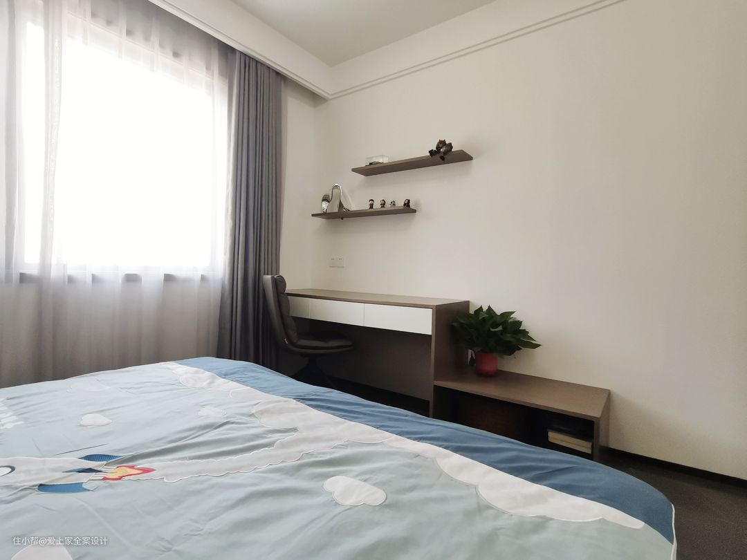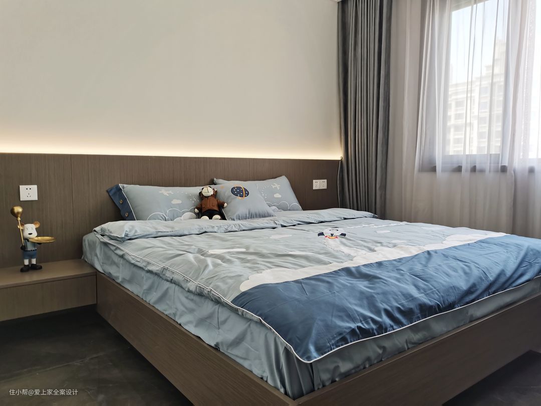 在灯光方面我们做无主灯、无电视、无床尾凳的设计,双层窗帘,白天拉上纱帘,既挡太阳又不会影响采光。这些设计都让卧室空间增加通透感,照明任务交给床头灯带,同时营造温馨舒适的氛围感,电视、床尾凳对于小卧室来说实在是没有必要性。