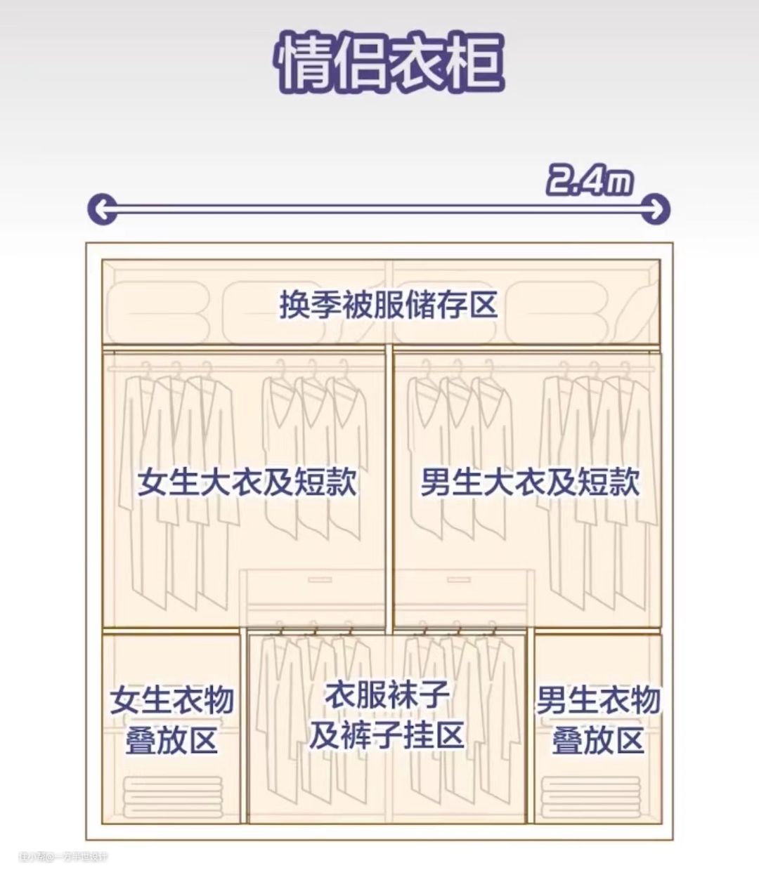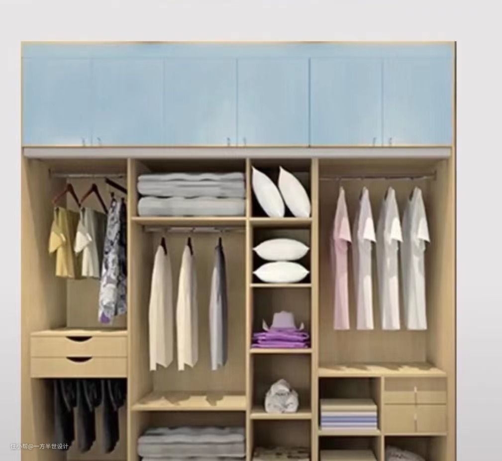 衣柜一般分为五大区域:被褥区 在顶部,高度在40-50cm