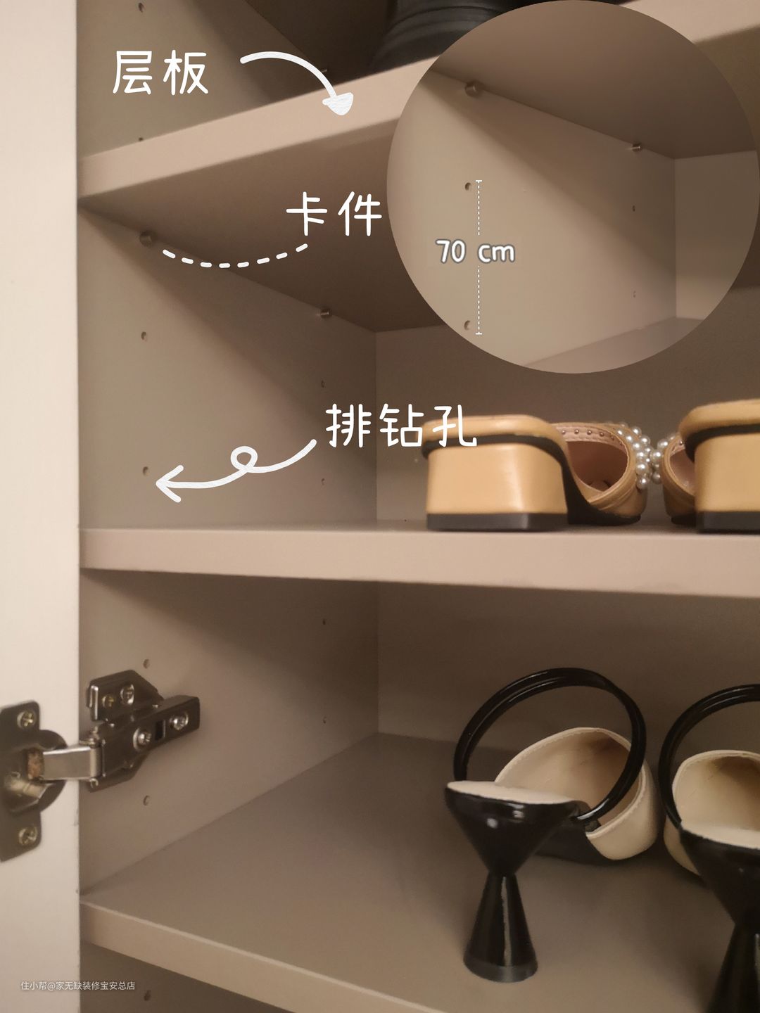 简单来说就是:侧板上每隔70mm打一个孔,层板就可以根据鞋子的高度随意调整间距,不浪费空间。