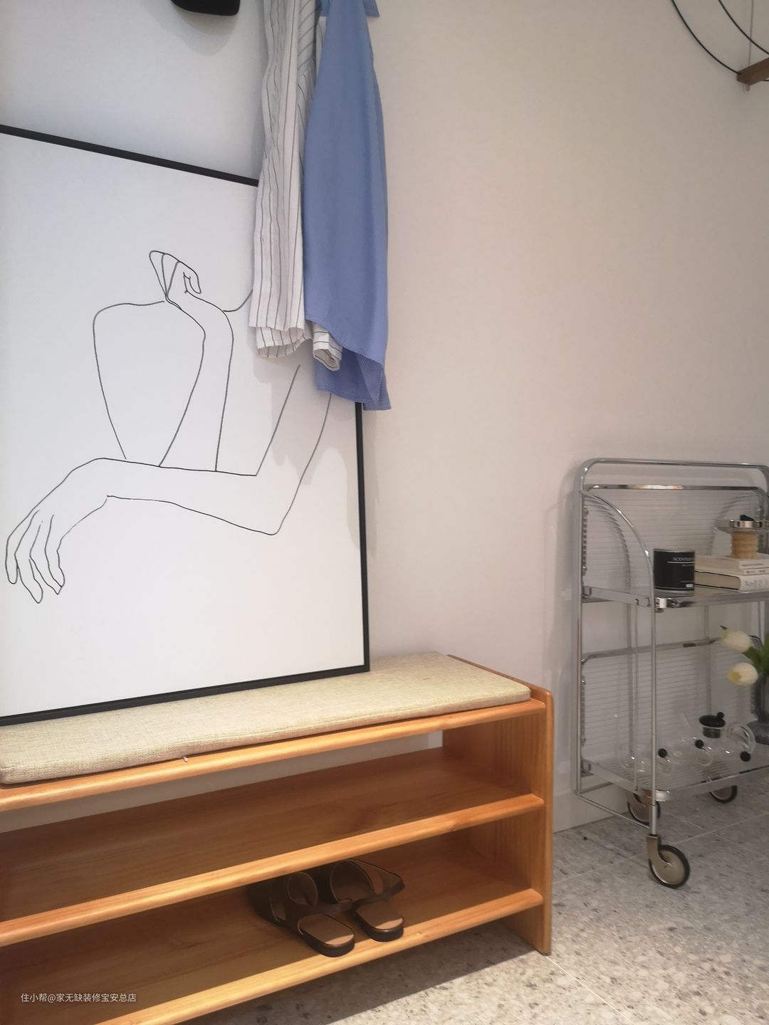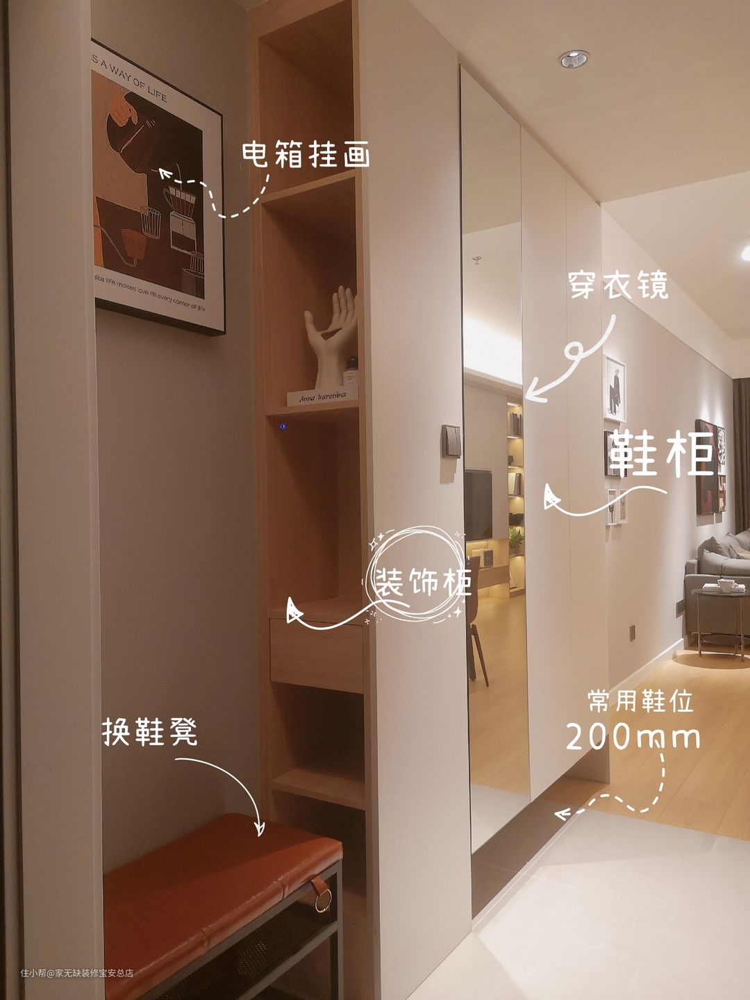 这样的鞋柜省时省事,柜门做面穿衣镜不占用墙面面积,侧边的装饰柜摆放艺术品,进门手里拿的钥匙、袋子等还可顺手放置,换掉的鞋子轻踢进去到常用鞋位,简直是懒人福音了!快来试试叭~