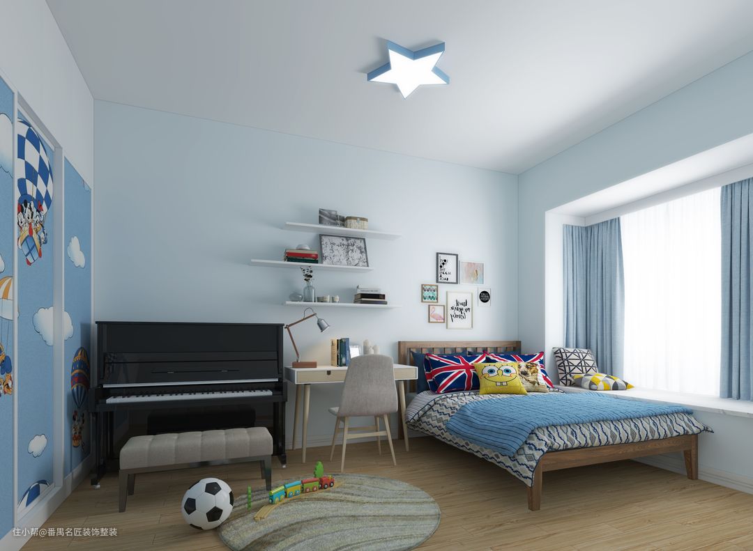儿童房以浅蓝色为主色调,搭配书桌,吊柜书架,钢琴,摆上一张木质的床,简简单单又充满童趣。