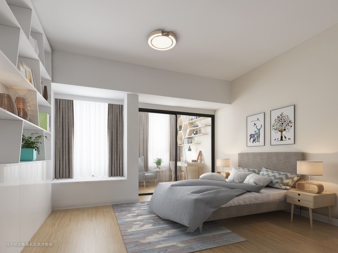 长辈房全屋整体白色+奶油的基调,配备了收纳柜、床头柜,用透明的玻璃隔出一个书房的空间,打造出一个安静的读书区。