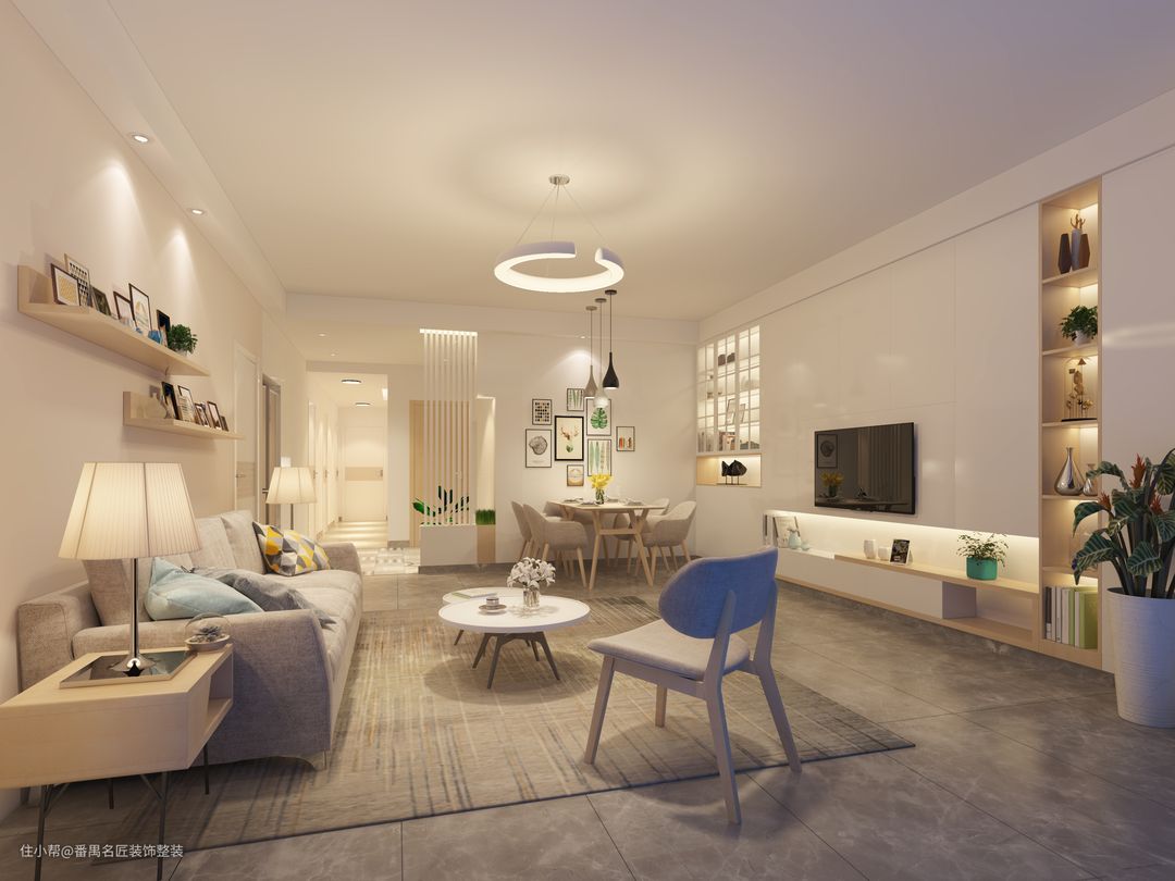客厅利用布局合理分布灯具,通过不同的吊灯、射灯,灯带、台灯、来组织灯光层次,打造出温馨的效果。电视柜整体采用白色结合木色,设计成柜体的形式,增加收纳,右侧为开放式格子,可以用来摆放绿植等艺术品,同时起到很好的装饰效果。