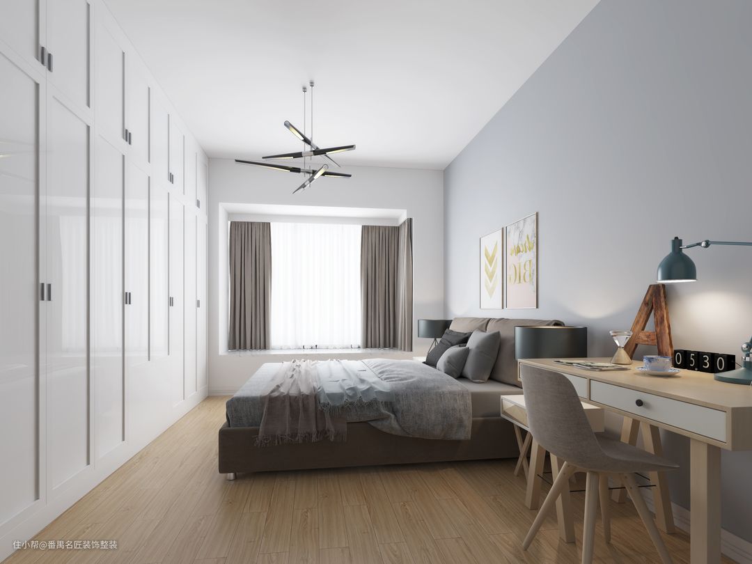 主卧整个空间色调以白色和蔚蓝色为主,搭配原木色,简单的设计,打造朴素温馨的舒适空间。旁边设计原木的书桌,平时可以在这里办公读书,看电视。