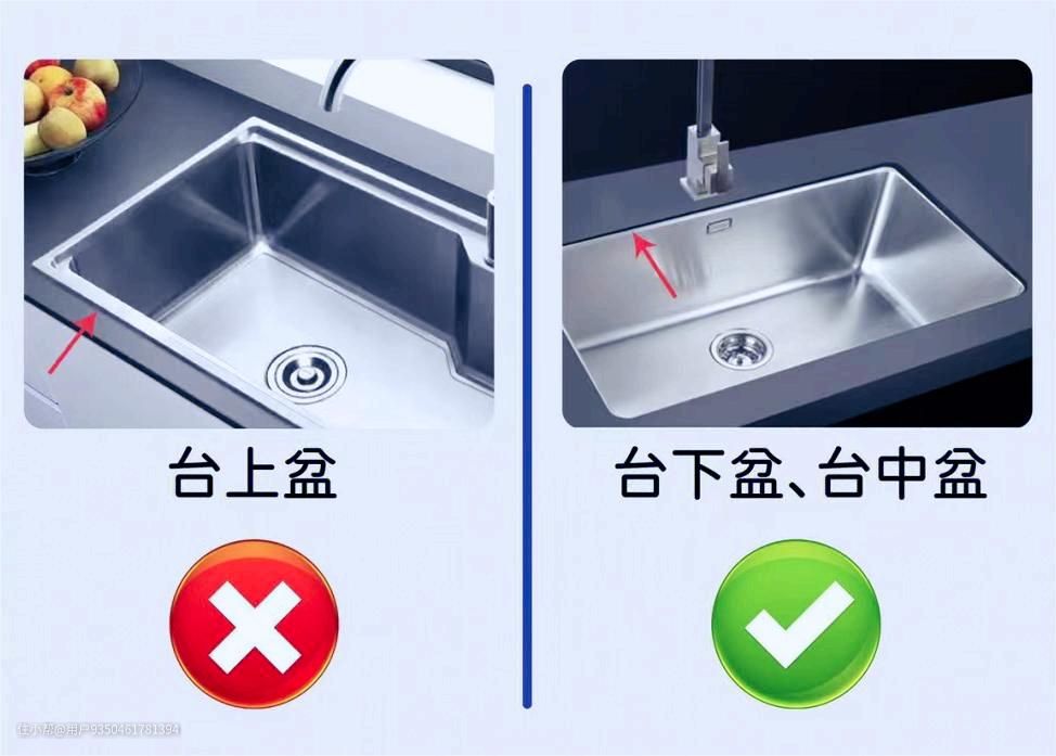 台上盆:由玻璃胶固定的,与台面接缝位置容易藏污纳垢,久了发霉变黑,甚至可能导致水槽翘边,水漏到料理台面里。