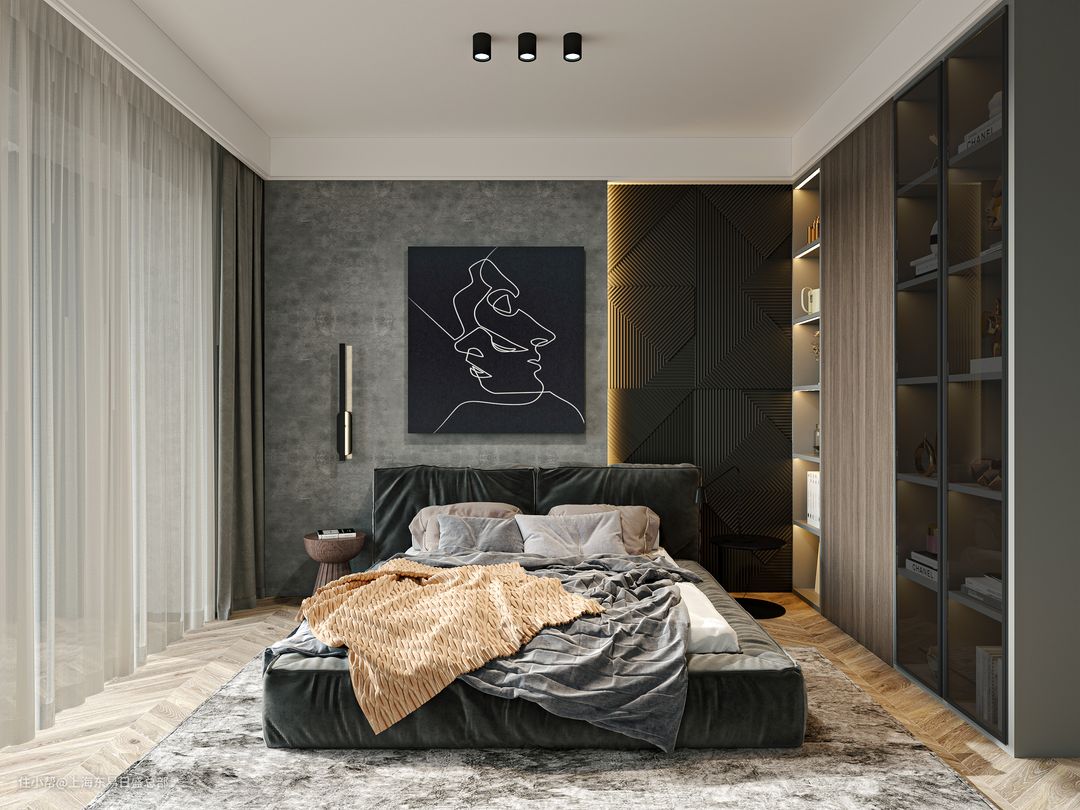 主卧空间我们延续了浅灰色的空间基调,床头背景墙做拼接处理,简洁大气,搭配简洁的黑色装饰画,呈现空间层次感。黑色的绒面地台床简单却质感十足,侧墙添加版开放式柜体,大气十足。