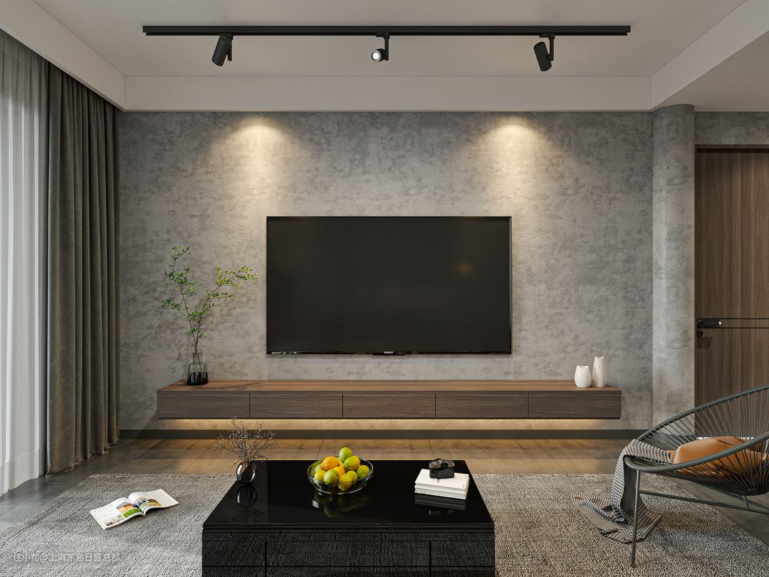 电视背景墙同样选用了微水泥材质,质感十足。壁挂式电视干净利落,搭配轻巧的悬挂式电视柜,简洁舒适。底部添加了氛围感十足的灯带,营造温馨雅致的光线环境。