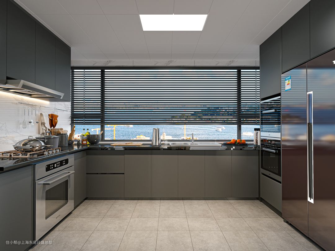 厨房空间非常舒适,我们选用了U型布局,保证空间的最大化利用。取菜、洗菜、备菜、烹饪一体化动线舒适流畅,保证下厨效率。蒸烤箱做内嵌式处理,保证简洁利落的视觉体验。