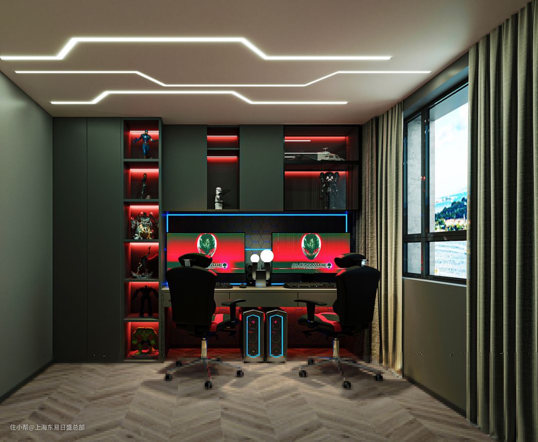 电竞房整体选用了无主灯的设计,简单又不失氛围,墙面硬装选用了墨绿色的空间基调,搭配红色的开放式柜体和灯带,打造强烈的视觉冲击感。业主两人平时都比较喜欢玩游戏,整体暗色系的设计,长时间打游戏也不会造成眼睛疲惫。