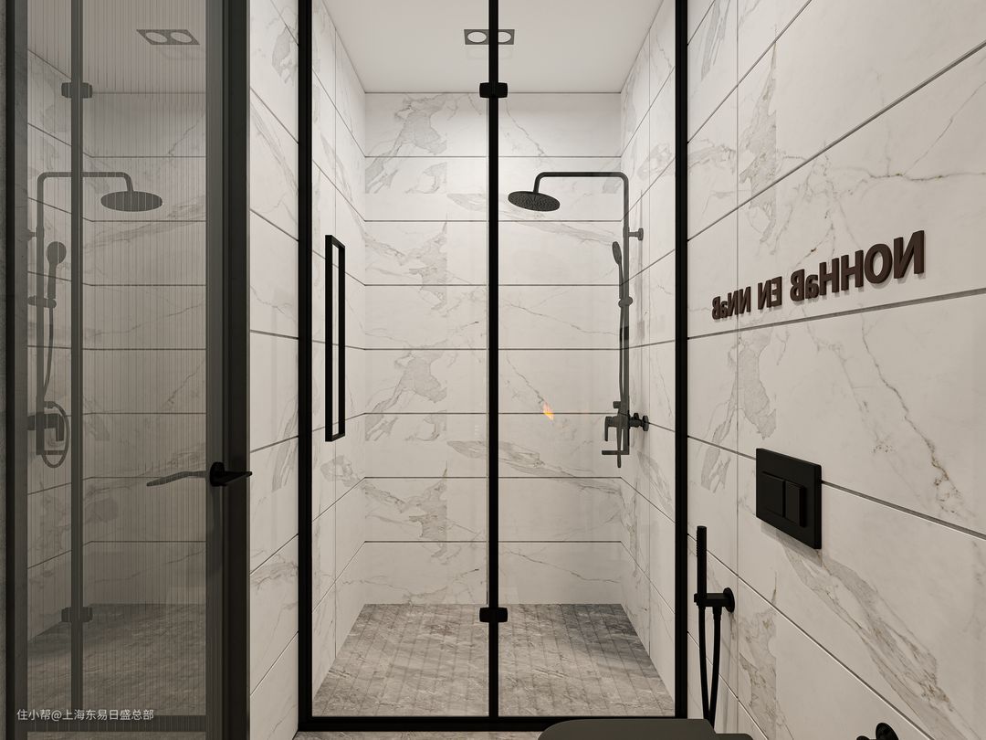 卫生间我们选用了白色的空间基调,通透感十足。使用黑框玻璃隔断划分单独的淋浴房,卫生清洁更加方便。淋浴房地面使用防滑地砖,老人孩子沐浴更安全。