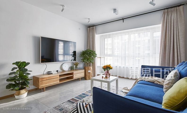 这款旧房改造装修效果图户型为三居室,面积90平米,采用了日式风来设计装修,主要以白色调为主,加以蓝色进行辅助,让空间不会显得单调,天花直接抹平不做造型,与墙面颜色保持一致,更显简洁,也更为的统一,通铺灰色地砖,加上良好的采光让整个空间变得更为宽敞明亮,搭配上蓝色布艺沙发和绿植,既温馨又自然舒适。