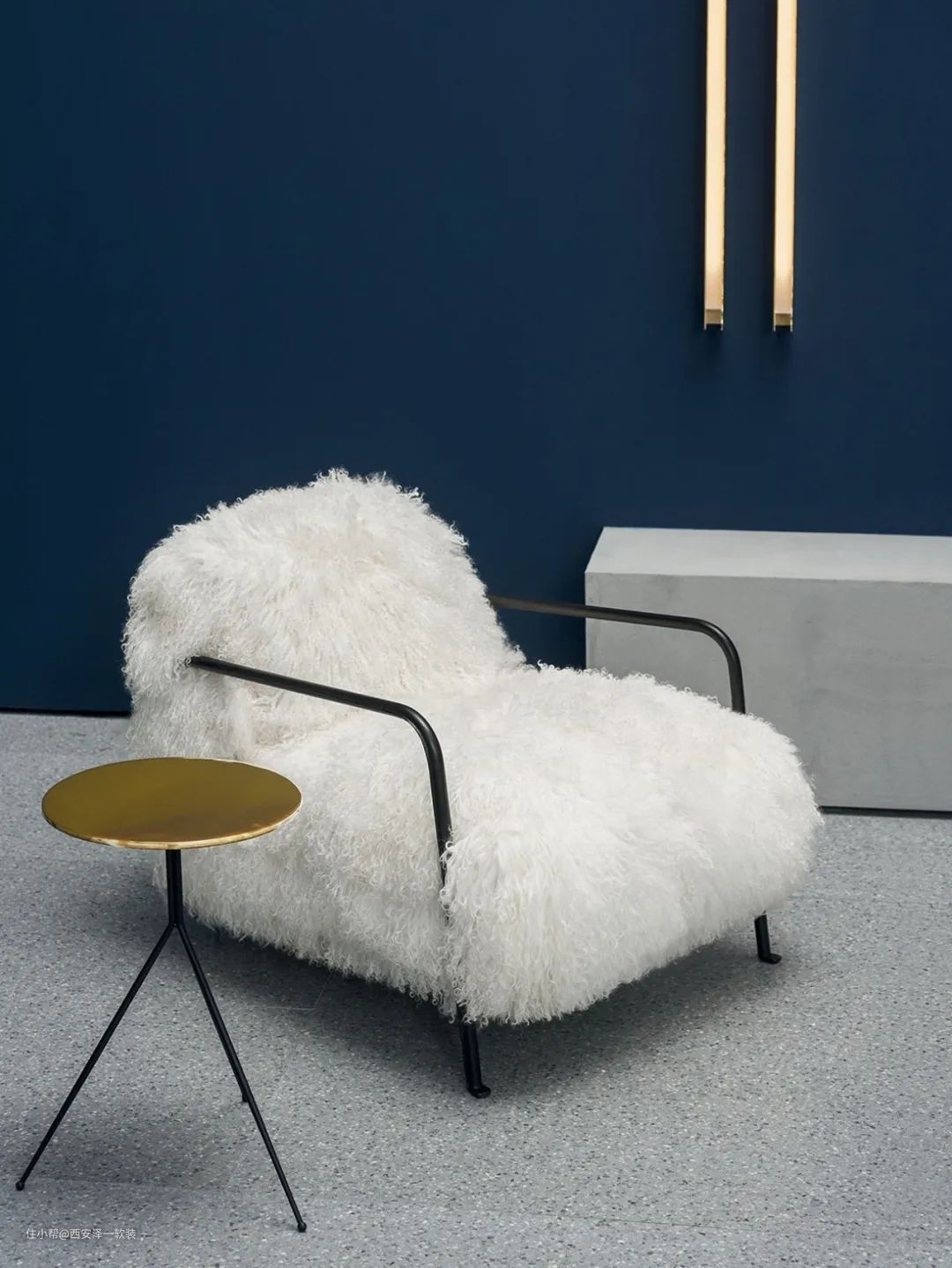 它有着简洁而不简单的结构特征,椅子的靠背和坐垫部分覆盖着厚厚的毛,这与纤细的椅子腿形成鲜明对比,整体看起来既蓬松柔软又不失时尚和优雅。纤细的扶手是一大特色,与大片的皮草面不同,更像个时尚达人优雅至极,能轻松驾驭不同风格的空间。