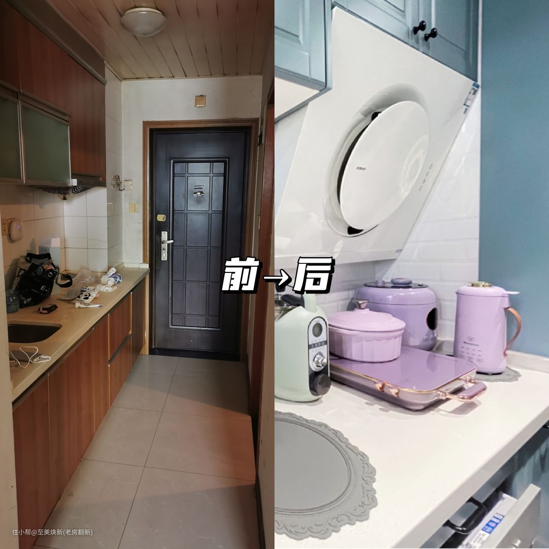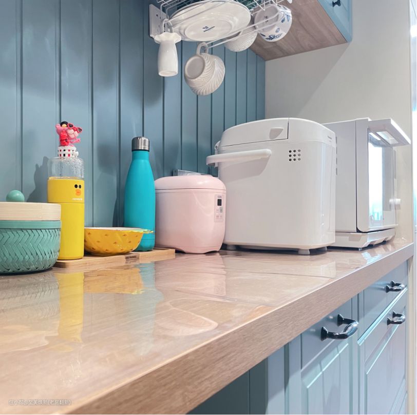 改造后的厨房调整了整体的配色,白是蓝色清新亮眼,香芋紫,牛油果绿的水壶,电磁炉,煮饭锅非常小清新,不会有太多的油烟,方便一个人的轻食。