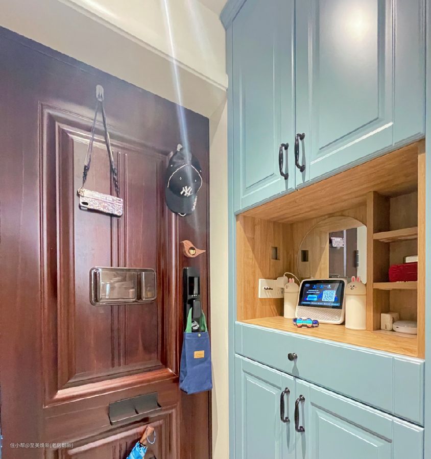 进门两侧一侧设置玄关柜,一侧设计成厨房,玄关柜做成嵌入式既增加了收纳空间,实现无尘入户,又不占用进门位置的空间。