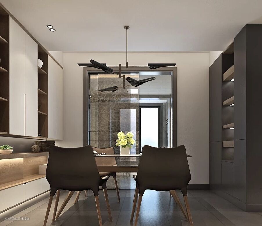 2.通过几何、线条等造型感十足的吊灯、餐桌来打造餐厅的现代感。