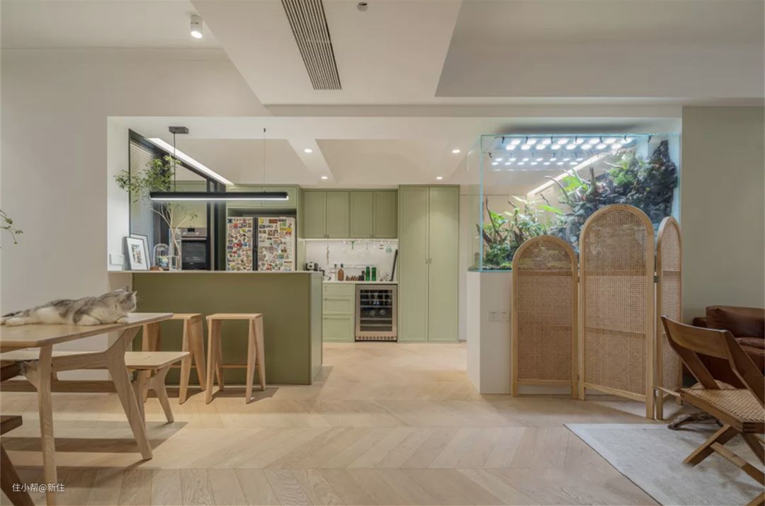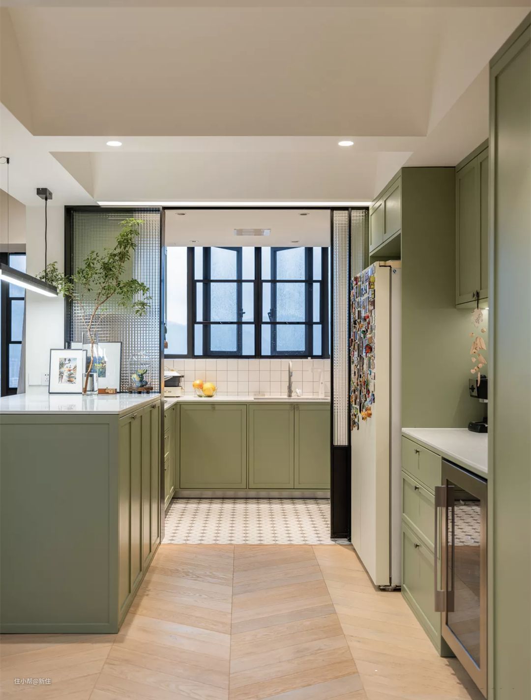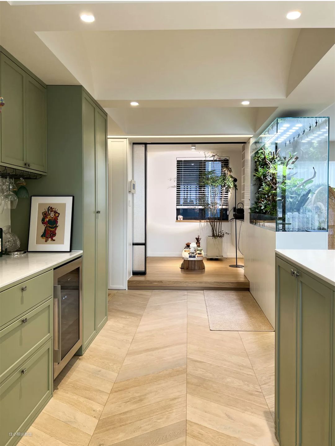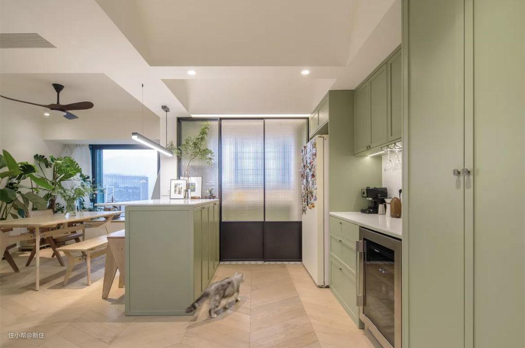 打通厨房隔墙,引入自然光线,搭配清新抹茶绿色柜子,屋主这个大胆的想法,加上灯光渲染后的玄关,明亮、清新而有温度。