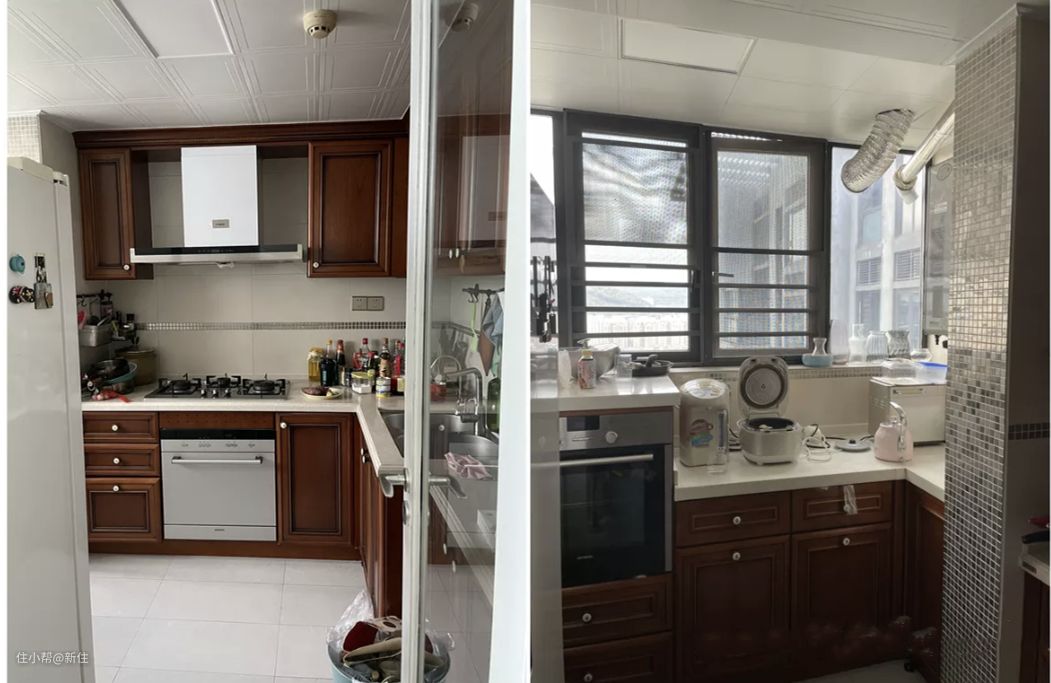 再将视线移至进门右手边的厨房,与原本美式樱桃木橱柜相比,果然,装修不在花了多少钱,而在乎审美。