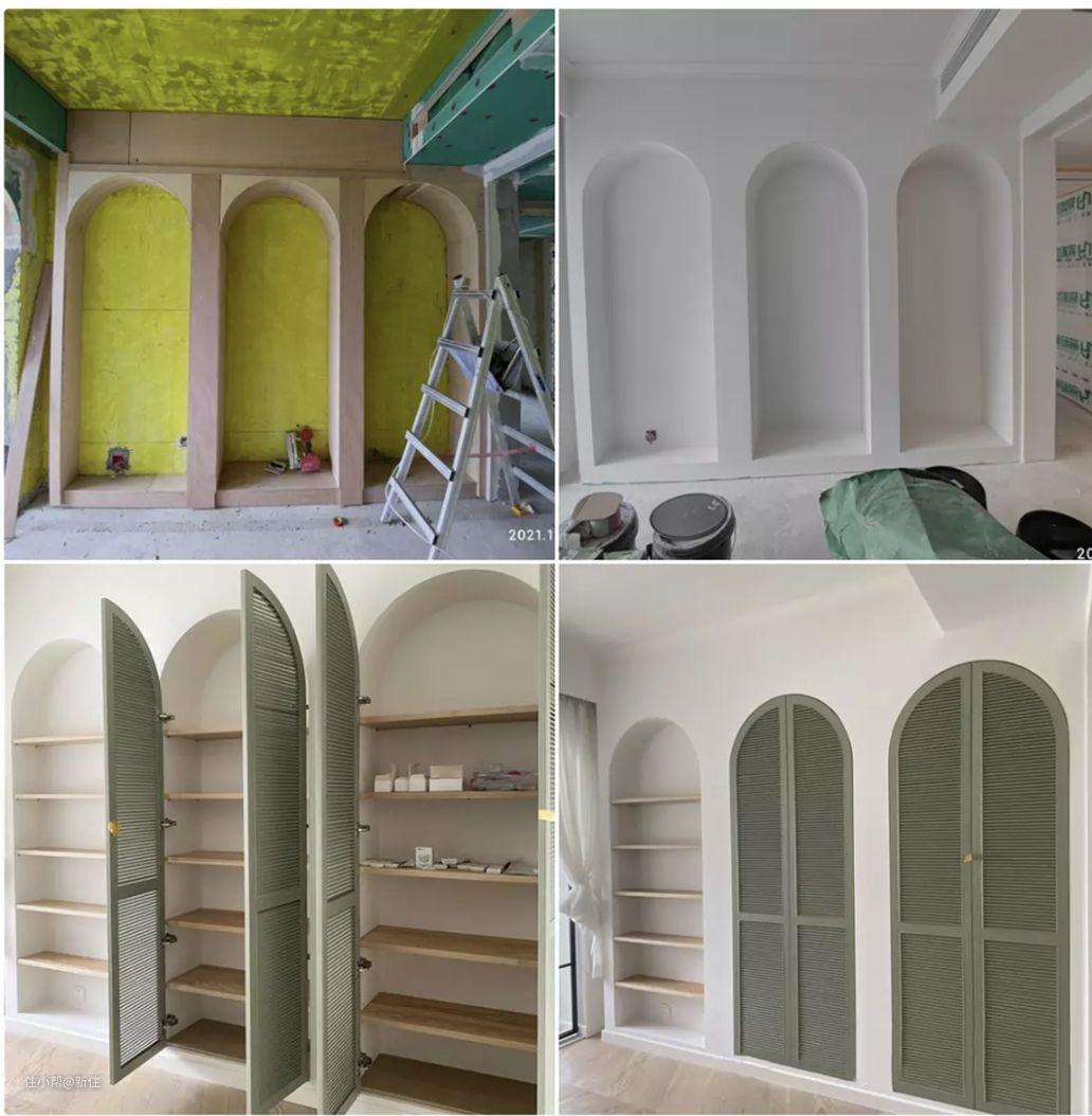 为了增加美观性,墙体处设置三个拱形门,开放区薄区层板架展示纪念品和常用书籍,带门的区域稍深,则用来收纳日用品和杂物。