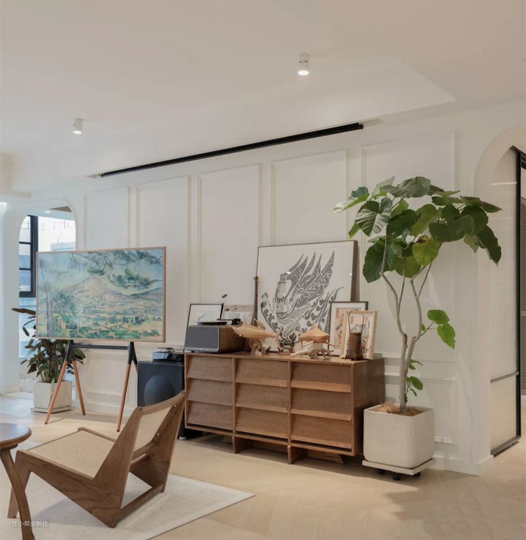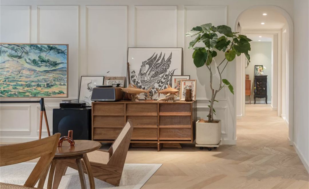 所以,屋主在墙面用pu线简单进行线条勾勒后,选择了一款古朴有设计感的斗柜,陈列展示各种工艺品,是装饰,亦是艺术,同时也是功能与精神的完美结合。