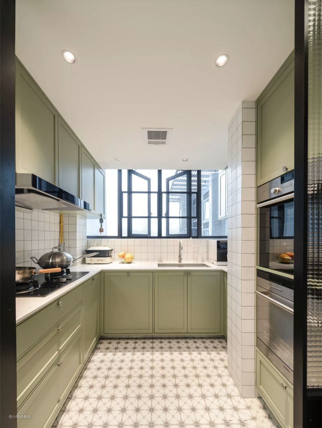 中厨区清新抹茶绿色的柜子,搭配小花砖,又是别具一格的感觉。