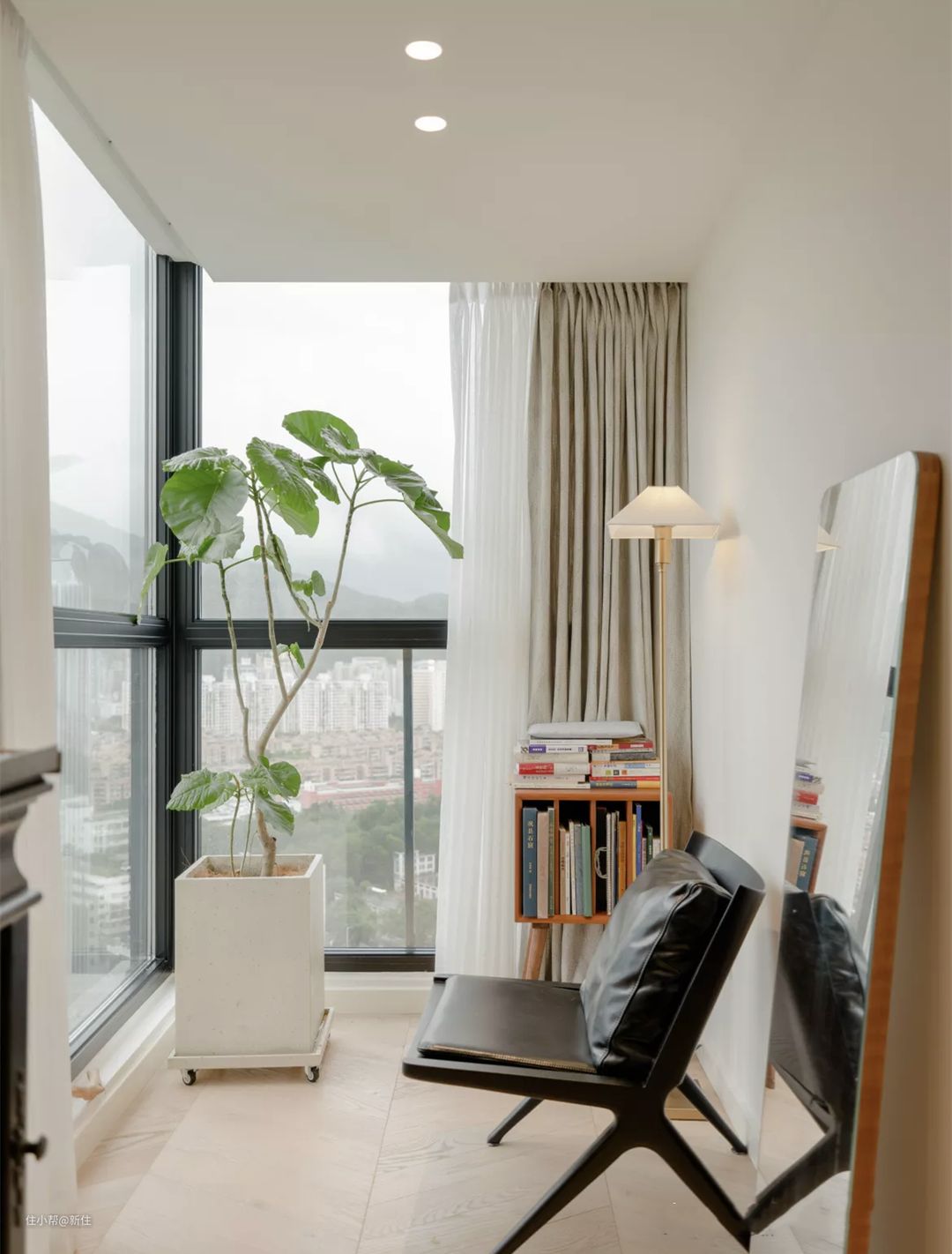 主卧因为紧邻交通要道,设置成了套房模式,配上大落地窗、休闲阅读角,空间功能性更强。