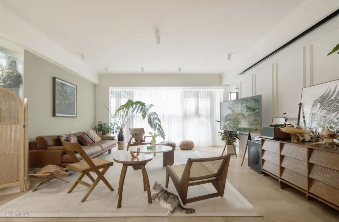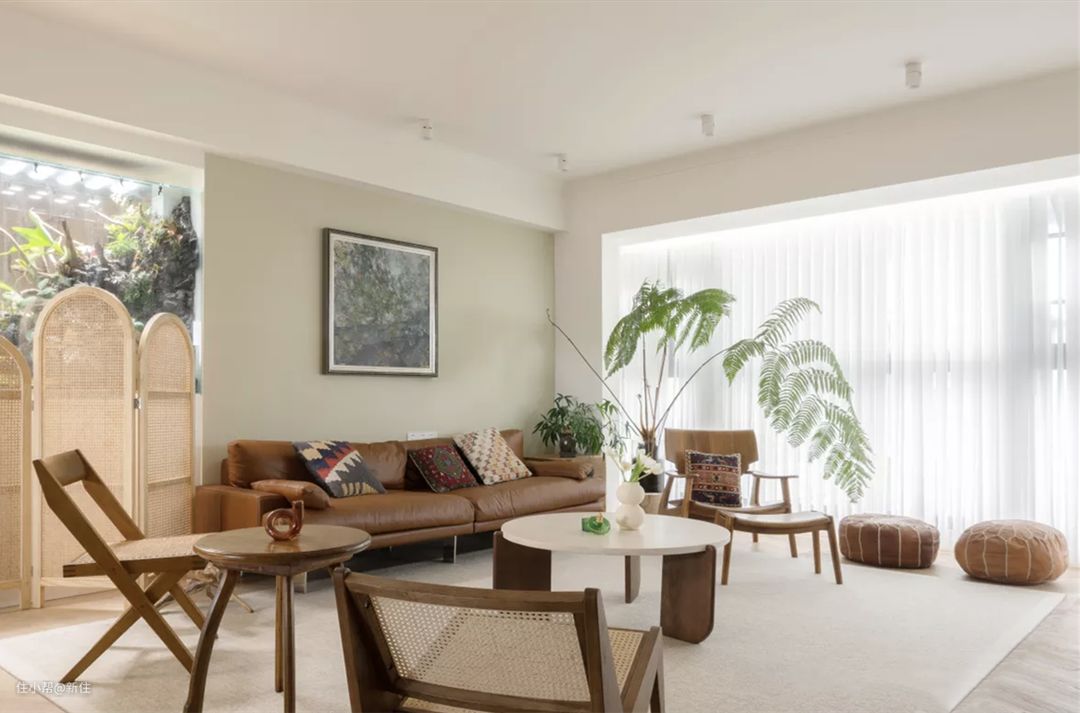 原木+复古棕+蕨类绿植,客厅的休闲场域绿意环绕、光影摇曳,处于这样一个客厅里,紧张工作了一天的心,不放松下来都难。