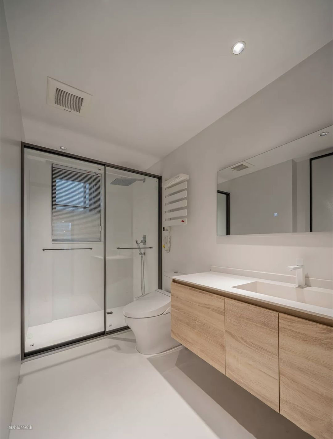卫生间布局本身干湿分离还算合理,为了保持整体风格统一,没有做大的改动,在原卫生间墙地面覆盖了微水泥,更换了五金配件,实现简约清爽的卫浴空间。