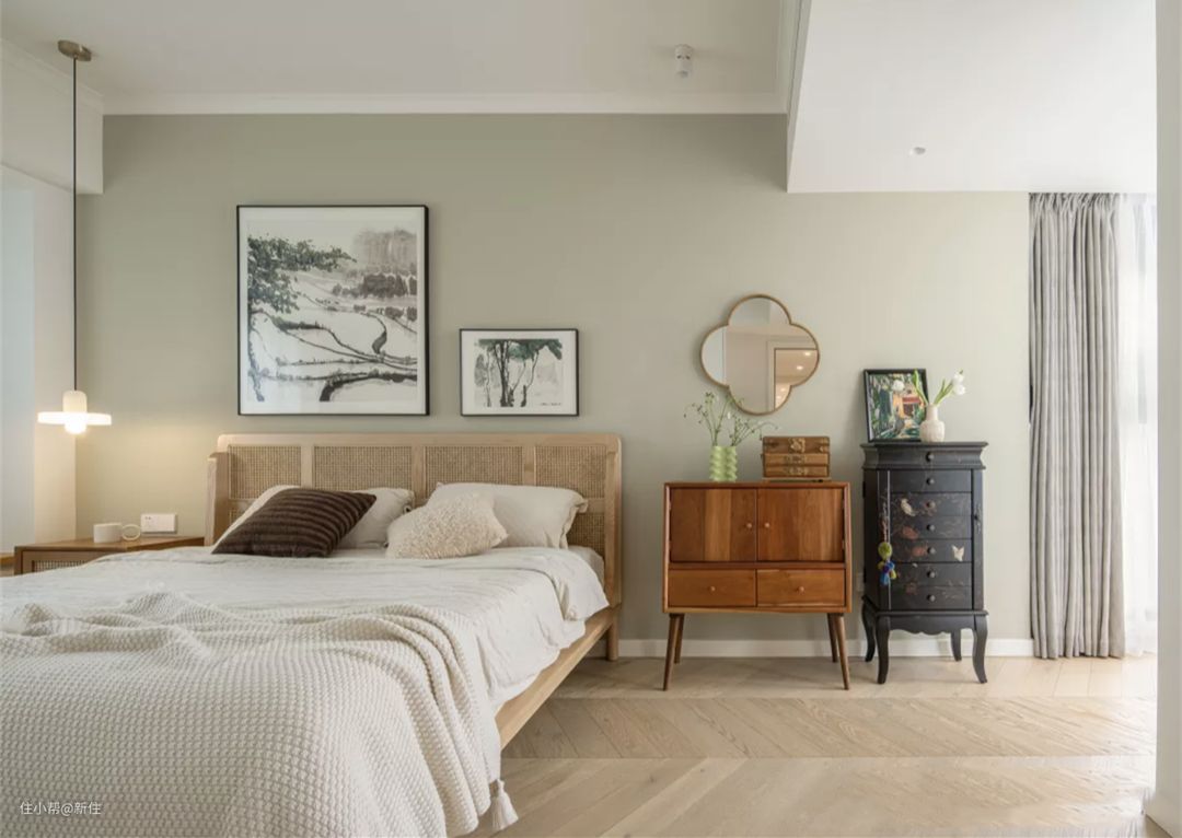 卧室延续了客厅的色调,简约而不简单,同时藉由家居单品来展示空间魅力和主人气质。