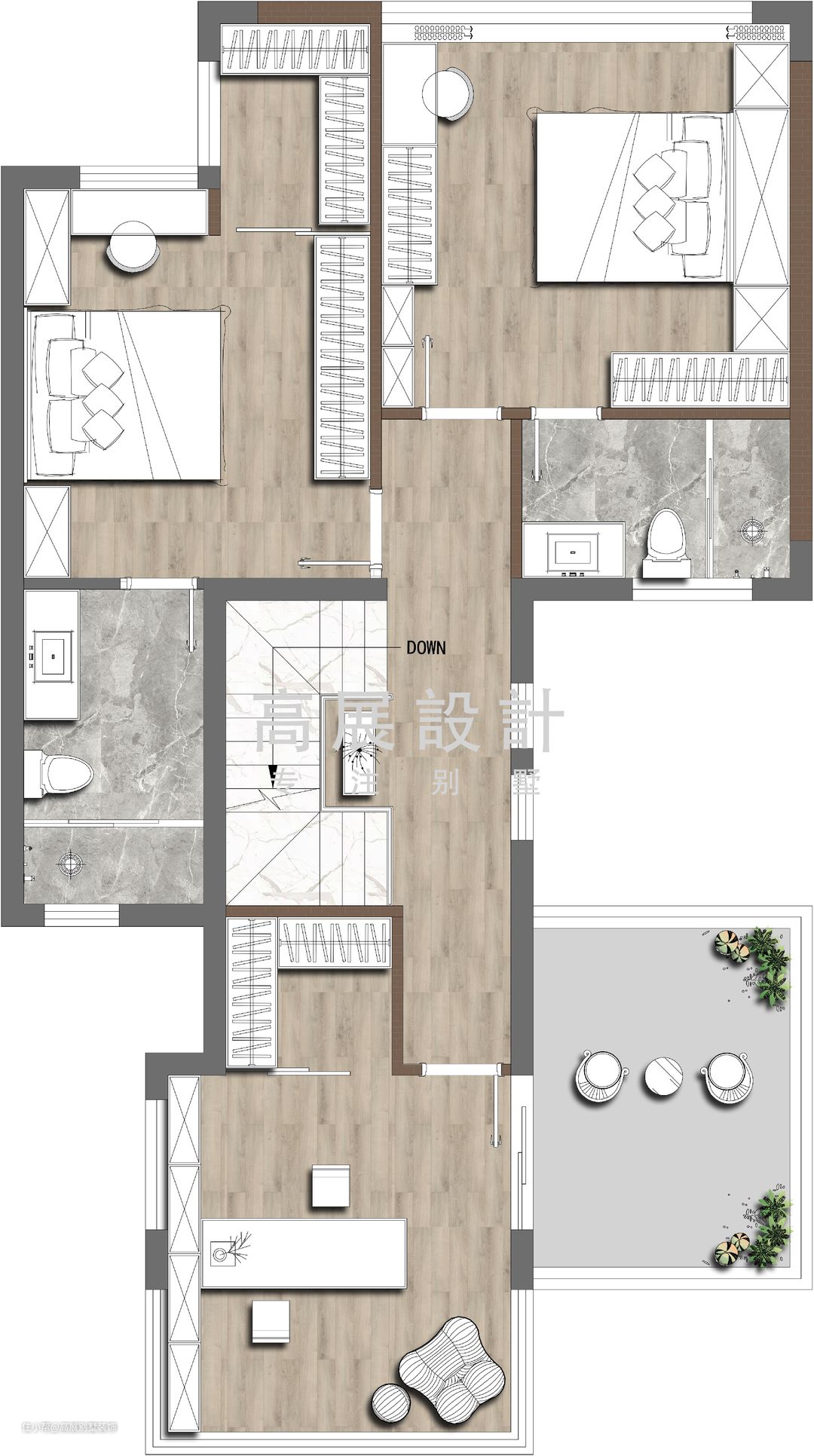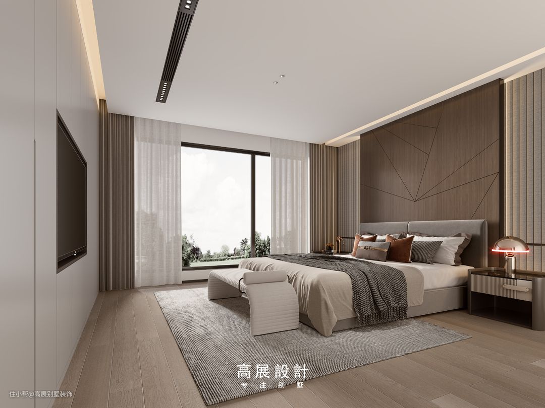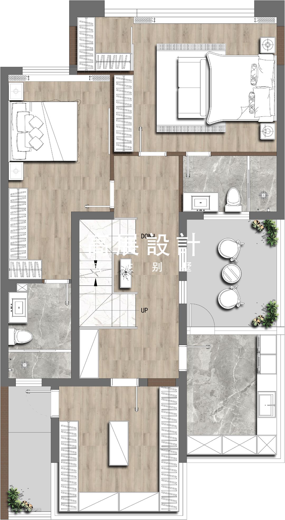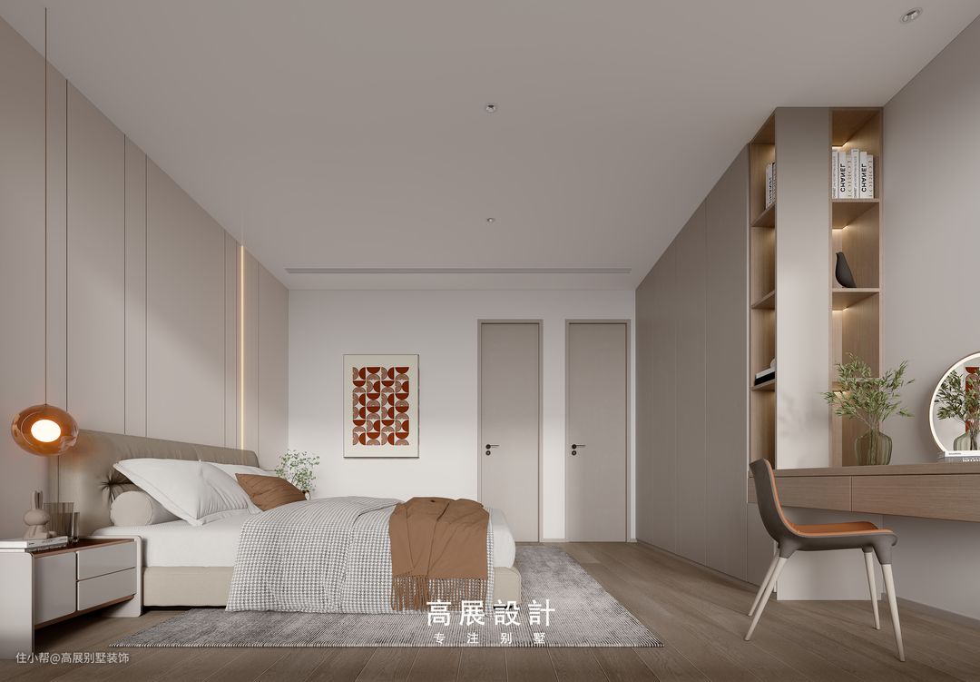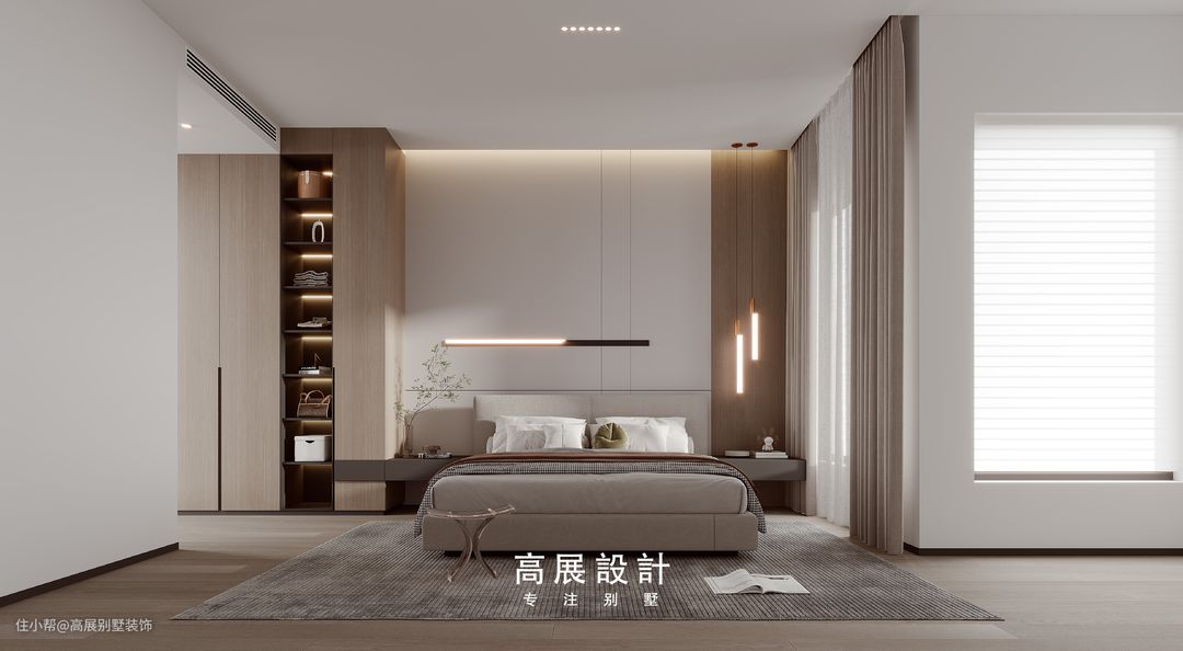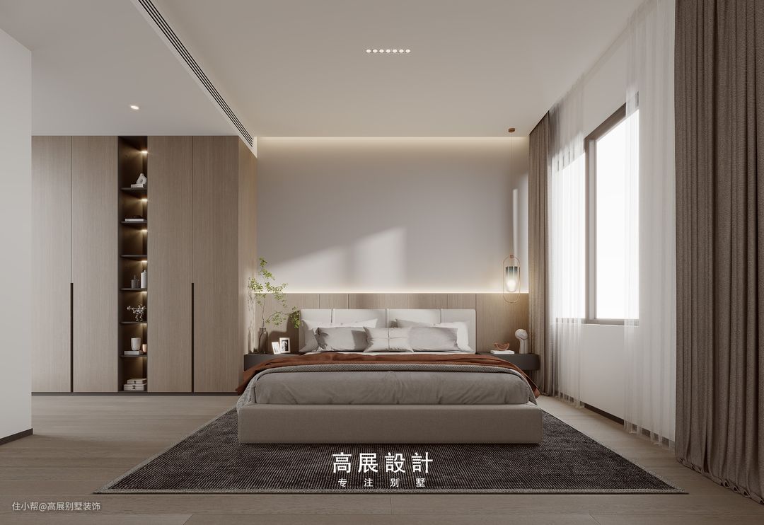 二层、三层为居住空间,设计师将这层规划为两间卧室套房、衣帽间和洗衣房。双卧室均设L型衣橱来满足收纳,干湿分离的盥洗空间,朝南带落地窗,居住起来非常的舒适。