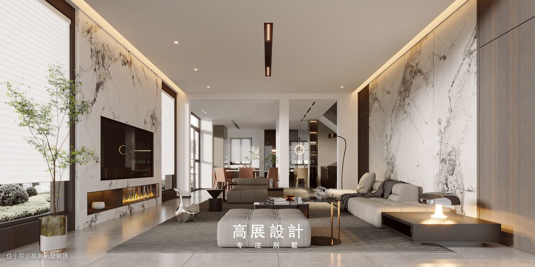 一层为居者的生活空间,设计师将其规划为开放式客餐厨及一间卧室套房,豪华沙发会客厅、圆桌式独立餐厅以及新增的西厨区域,整体空间非常的开阔。U型厨房选择折叠门作半开放式,从厨房-西厨-餐厅,满足从烹饪到饮食的过程非常的流畅。