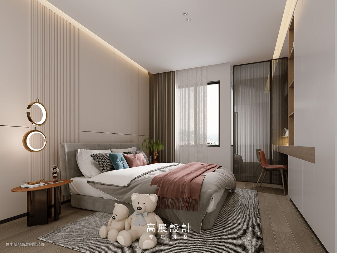 设计师将三层规划为两间女儿卧室套房、一间书房兼衣帽间的多功能房。卧室套房的设计增加彼此的私密性,居住起来幸福度更高。从多功能房推门出去就是大露台,可以放松休闲,也可以在露台上摆放餐桌,在天台上吹吹风,吃吃饭,聊聊天,看着满眼绿色,吸着新鲜空气,实在是种享受。