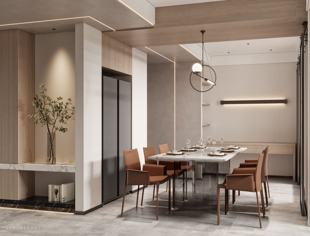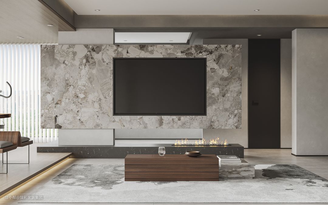 造型不再拘泥于传统方正框架,采用整面岩板,嵌于错落开合的墙体中,既丰富了空间景深,不同材质的运用拼接,还赋予了现代居住空间的质感。