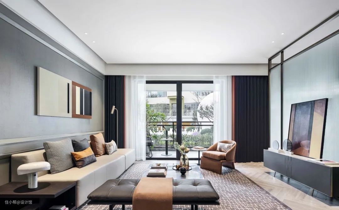 ▲客厅现代大方的设计,天花吊平顶的简洁造型,整个空间充满端庄优雅而自然的设计氛围感;地面铺上暖灰色地毯,布置上皮艺材质的沙发与凳子,电视墙以玻璃屏风造型设计,也让空间显得更加雅韵高级。