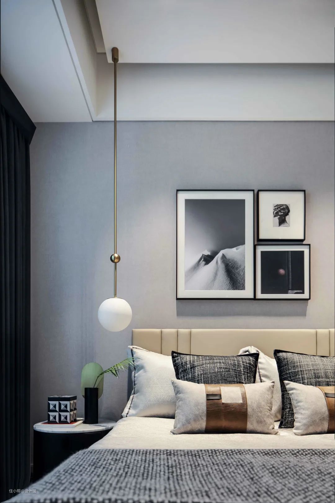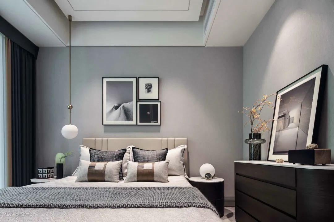 ▲次卧整个空间的墙面是灰色为主,而斗柜与床头柜则是黑色的,加上灰色皮艺床,床头墙挂上黑白灰的组合装饰画,两侧球形的吊灯与台灯布置,带来一种现代简约而端庄的卧室空间氛围。