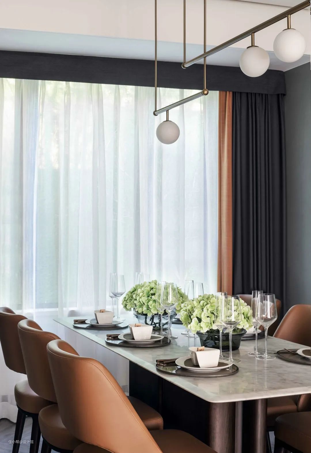 ▲以岩板台面的餐桌,搭配橙色皮艺餐椅,窗帘是灰色+橙色的撞色搭配,餐桌上摆上精致的餐具、高脚杯与插上鲜花的花瓶,餐桌上方装一盏金属杆的球形吊灯,营造出一种现代雅致的用餐仪式感。