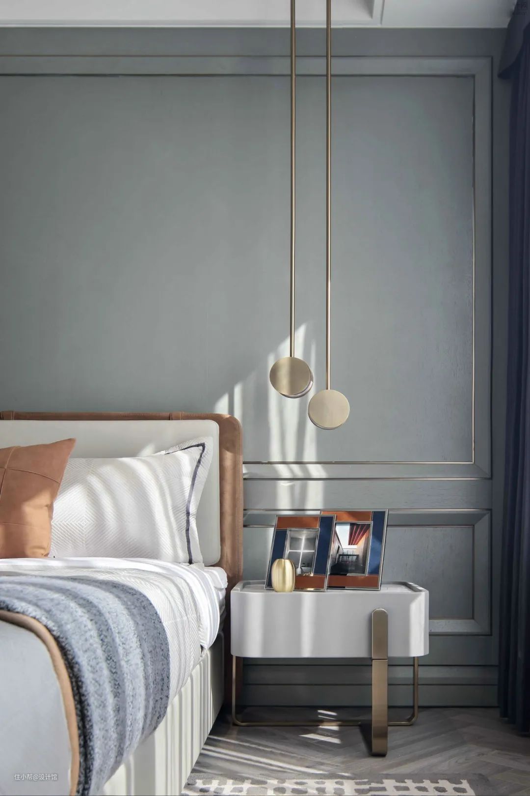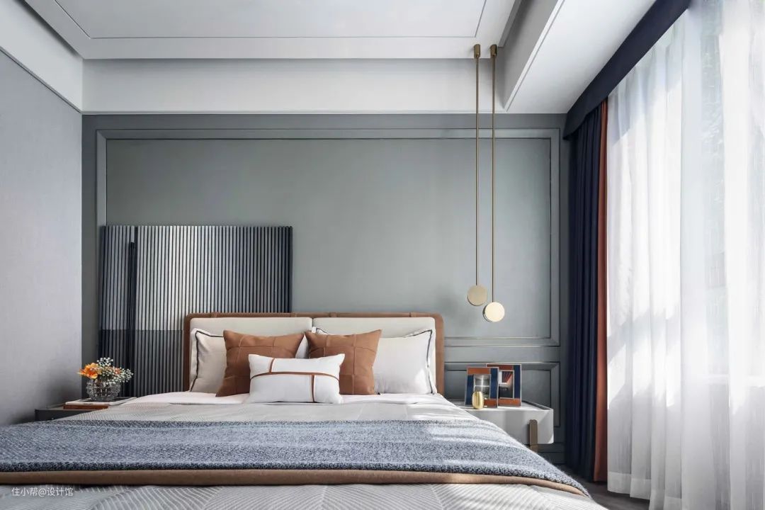 ▲卧室床头墙蓝灰色的主体,四周是边框线条造型,左侧靠一幅竖纹图案的装饰画,布置上米灰色的皮艺床,布置灰色+咖色的床单枕头,整个卧室充满华丽优雅的舒适设计感。