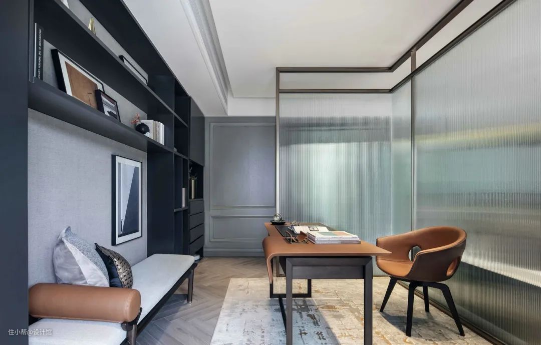 ▲书房设在电视墙后方,中间以长虹玻璃作为隔墙,让书房空间更加明亮,居中摆上橙色+黑色撞色的书桌椅,靠墙装上书架+休闲凳,让书房空间有着更丰富实用的功能。