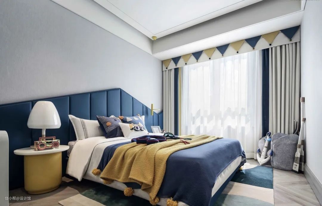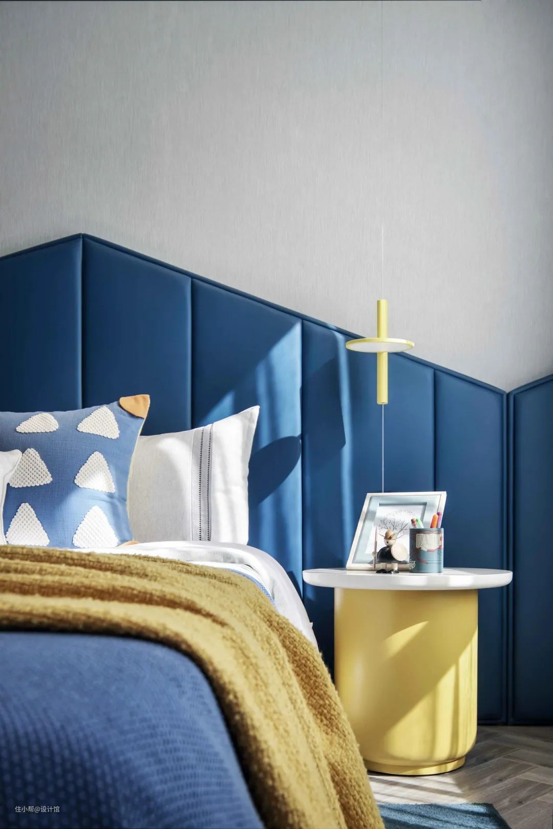 ▲儿童房的床头墙在灰色的墙布基础,床头靠背区域装了一个屋顶造型个的护墙板,护墙板与床单都采取蓝色的搭配,在加入黄色的毯子与床头柜,碰撞出一种活泼跳跃的色彩。
