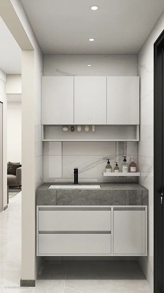 两间卫生间将简约格调进行到底。不同深度的高级灰将品质感拉满,绿植花卉生机勃勃,悬空式的台盆柜与壁龛组合增强收纳,方便清洁。