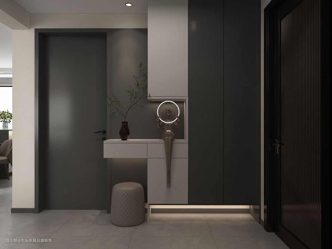生活需要充足的收纳。设计师在入户右手边设计玄关柜,通顶的柜体,鞋子收纳无忧虑;设计一组上下式分离柜体,视觉上不显拥挤,中间镂空部分可以随手放包包,钥匙和快递,解放回家时拿满东西的双手。下方悬空进出门用的鞋子有归处,进门整洁利落,心情也跟着美好起来。