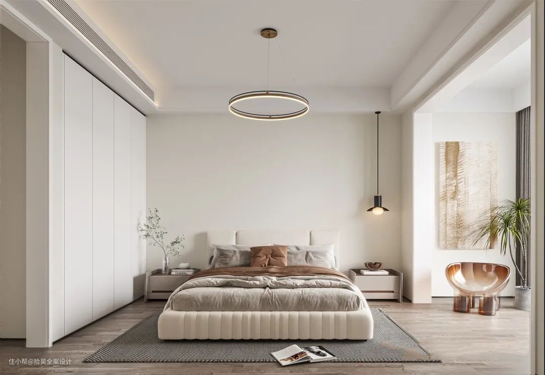 主卧以纯净的奶油白作为主色调,浅木色的地板与浅色系的家居、布艺感觉的家具,温馨惬意、干净明亮的空间氛围感。