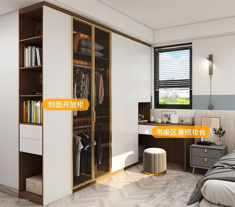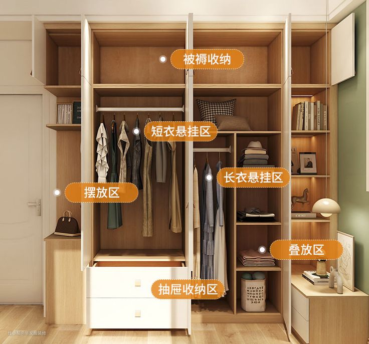 衣柜的布局分的也很细致,上方被褥收纳、短衣悬挂、长衣悬挂、收纳叠放、抽屉收纳还有开放格书柜下方还做了抽拉式的床头柜。