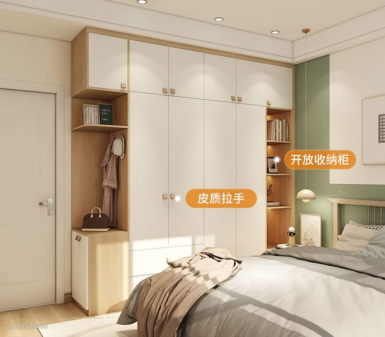 主卧的衣柜啊做了详细的分区侧边同样做了开放格,大小不同进行分区,可挂衣可收纳,柜门的拉手用了皮质的材料,让整个空间更亲近自然,色调也是更清爽